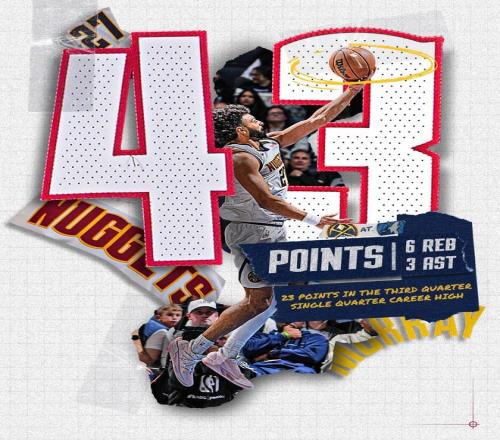 穆雷在第3节进入了得分模式,他单节12投7中,三分球5投3中,罚球4投全中,以58%的命中率轰下了23分。依靠着穆雷在第3节的暴走,掘金单节以45比29碾压对手,这也是丹佛最终取胜的关键。并且,单节23分还创下了穆雷单节得分新高。