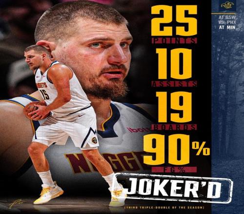 约基奇25+19+10创NBA历史第2神迹