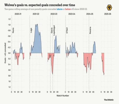 对狼队来说,唯一的些许鼓励是他们在九场比赛后的记录与上赛季完全相同。和那时一样,狼队基于他们所面临的高质量机会,实际丢球远远超过了预期,从11.5的预期失球中丢了19个。他们上赛季成功逆转了这一趋势,并需要再次做到这一点以自救。