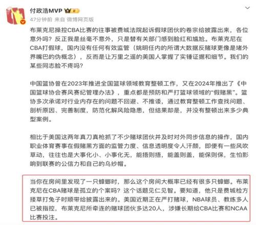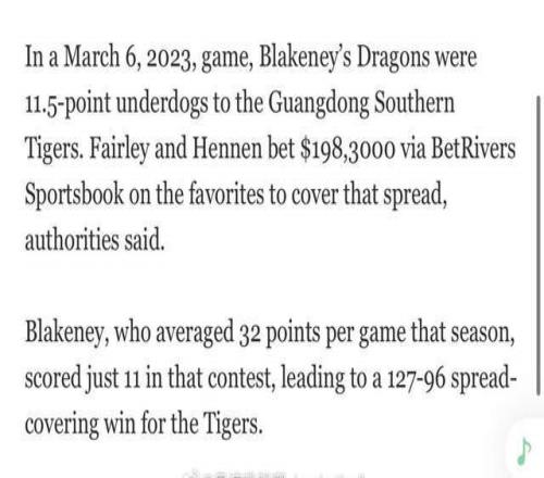 此次事件是美国媒体报道,美国这两年真刀真枪抓了不少赌球团伙并及时对外同步信息,此次抓到布莱克尼团队属于顺带披露,还不是专门侦察,作为对比,国内CBA公司并没有率先发现赌球、打假球的情况。